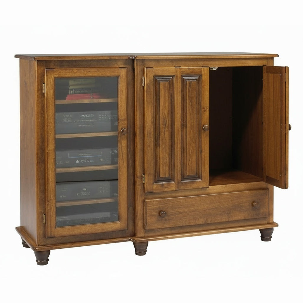 Bring timeless elegance to your living room with this Country Lane Entertainment Unit. It features beautifully moulded skirts that add classic character to any décor. The bi-fold doors open smoothly thanks to premium Blum soft-close hardware, ensuring quiet, controlled operation every time. Inside, dedicated stereo shelving keeps your audio equipment organized and accessible. Finished with water-based stain and a durable water-based polyurethane top coat, this piece combines solid wood craftsmanship with eco-conscious finishes that protect your investment for years to come.