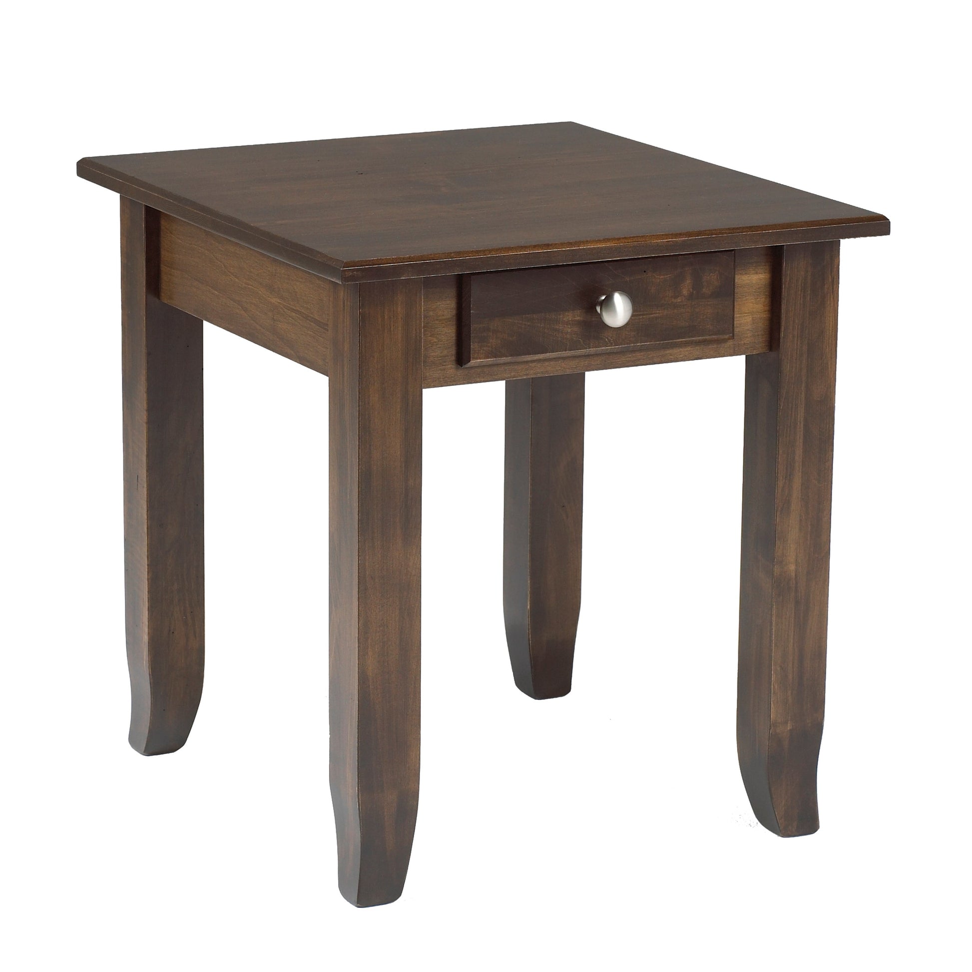 Crafted with meticulous attention to detail, this end table features a beveled edge top and elegant wing feet for timeless appeal. The single drawer, equipped with Blum soft-close hardware, glides smoothly and closes with precision—eliminating noise and extending durability. Finished with water-based stain and a protective water-based polyurethane topcoat, it resists water marks and everyday wear while maintaining an eco-conscious approach. A sophisticated accent piece for any room.