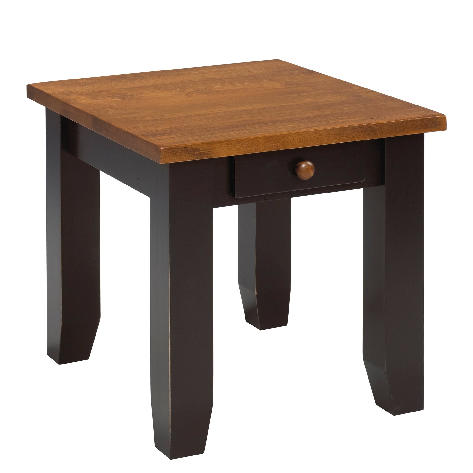 Rustic charm meets functional design in this solid wood end table, featuring a single drawer with smooth Blum soft-close hardware for whisper-quiet operation. The rough-cut surface celebrates natural wood character while the water-based stain and polyurethane top coat deliver durability and easy maintenance. A timeless accent piece that complements any room's aesthetic while providing convenient storage for essentials.